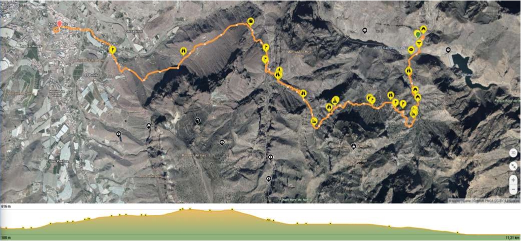 La caminata comienza en una pista de tierra situada en la GC‑210, en el tramo que une La Aldea con Artenara por el barranco de Tejeda (217 msnm). Desde allí nos dirigiremos hacia la pantalla de la Presa de Siberio, iniciando el ascenso por el barranquillo de Los Reventones, donde aún se conservan cuevas de origen prehispánico.
